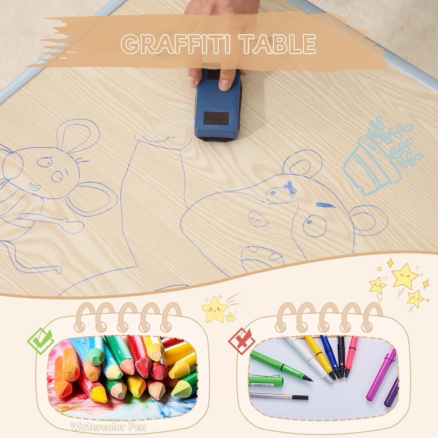 - 【Multifunctional Toddler Table】The dimension of this toddler table is 31.5''L x 23.6''W. Our toddler table provides ample space for various activities. Its tabletop allows kids to draw with oily or water-based paintbrushes, easily wiped clean with a damp cloth. Besides drawing, this table and chair set serves as a platform for studying, reading, eating, playing with toys, and more. Designed with edged borders to prevent objects from sliding off and rounded corners to safeguard children from accidental bumps.