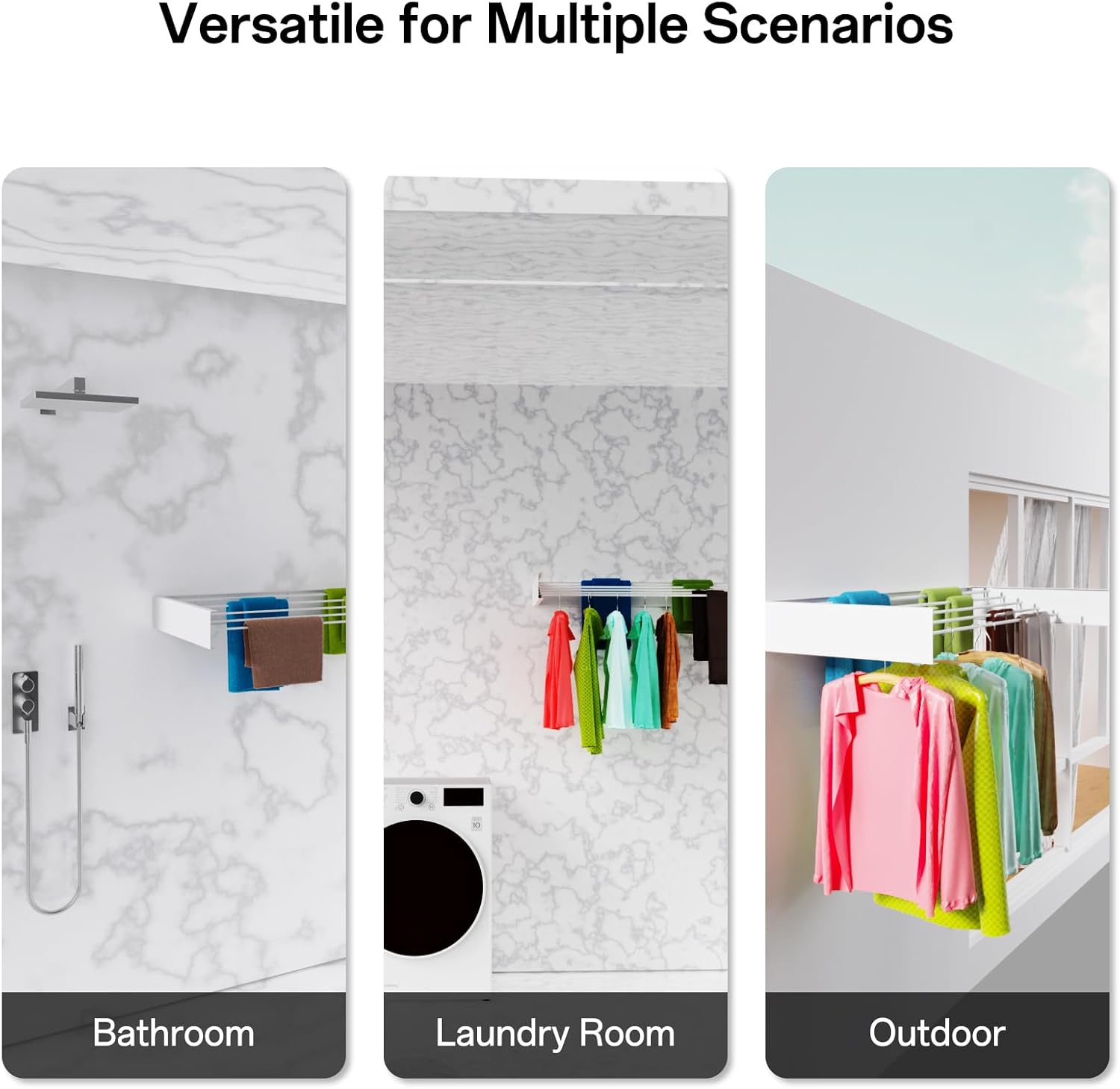 - 【Space Saving】This drying rack features a compact retractable wall-mount design that can be easily folded to save valuable space, 1 inch against the wall, the laundry rack can be neatly folded against the wall when not in use, freeing up ground space, it is an ideal choice especially for places with limited space. Also saving energy and contributing to the environment by air drying clothes.