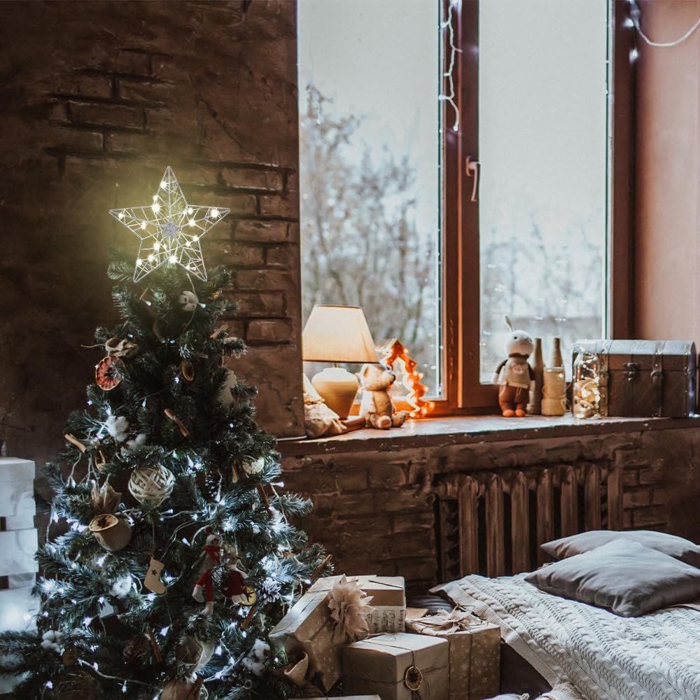 - đăBEST CHRISTMAS TREE COMPANIONăYEAHOME 5-Point star Christmas tree topper is silver glittered with LED lights embedded, creating a cozy ambiance. No Christmas tree is complete without a Christmas tree topper! The warm and clear lights will transport you to a mesmerizing night sky, reminiscent of dazzling stars. Our star Christmas tree topper is the perfect icing on the cake for your holiday tree, completing the magical atmosphere.