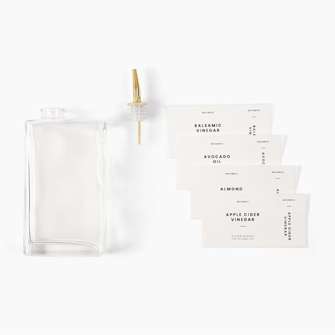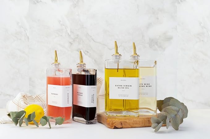 - Modern Kitchen Essential: Minimalism Inspired Cooking Oil Dispenser Bottle. This Set Includes Two High-quality 11.8 Oz (350 Ml) Glass Bottles, Two Gold Pourers, a funnel, and a 37 Label Set.