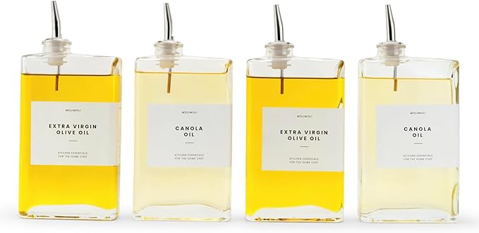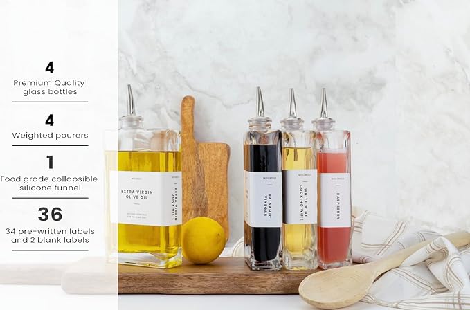 - Modern Kitchen Essential: Minimalism Inspired Cooking Oil Dispenser Bottle. This Set Includes Two High-quality 11.8 Oz (350 Ml) Glass Bottles, Two Gold Pourers, a funnel, and a 37 Label Set.