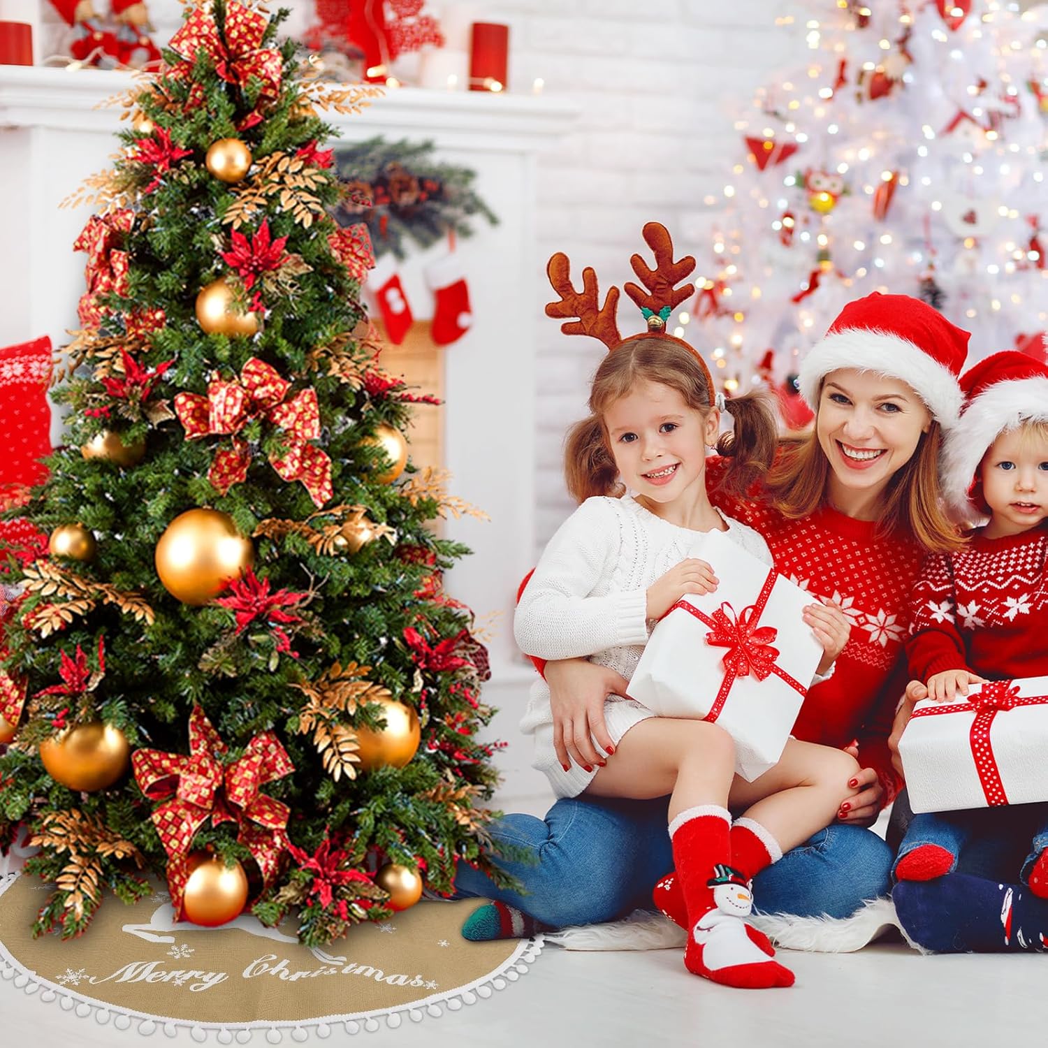 - Merry Christmas Tree Skirts:Our xmas tree skirt is printed with elk and various sizes of snow patterns, as well as the words "Merry Christmas." The edges are adorned with small, fluffy balls, adding a festive touch to your Christmas tree. This 36-inch tree skirt is perfectly sized for most Christmas trees perfectly. Before making a purchase, please measure the diameter of your tree to ensure a perfect fit