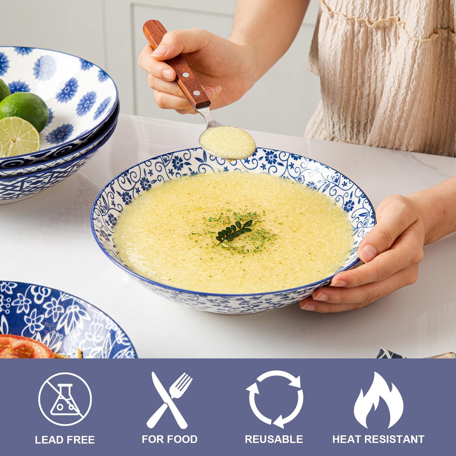 Ceramic Pasta Bowls Set - 40 Oz Porcelain Large Salad Bowls Serving - 9 Inch Wide Shallow Plate Bowls for Eating - Housewarming Wedding Gift - Oven Dishwasher Safe - Set of 6 - Vintage Blue