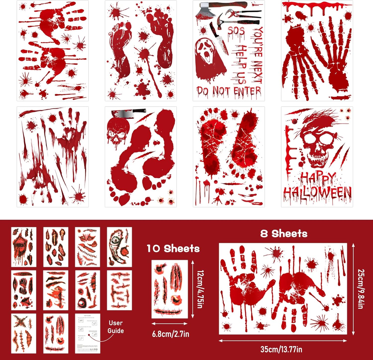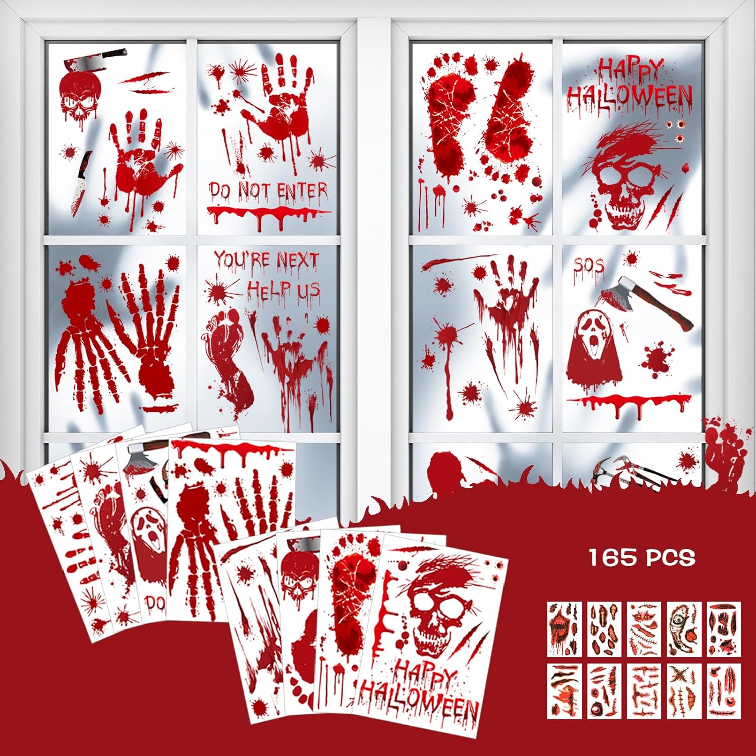 - PACKAGE INCLUDES: 8 sheets bloody handprint and footprint window stickers with 10 sheet Halloween wound tattoos (approximately 165 stickers)