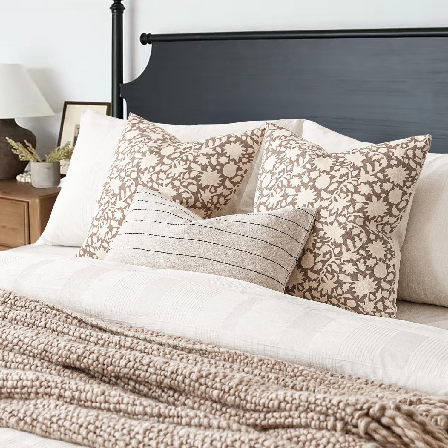 Foindtower Set of 2 Decorative Neutral Floral Throw Pillow Covers Accent Farmhouse Cushion Covers Boho Vintage Pillowcase for Couch Sofa Bedroom Living Room Home Decor Outdoor,22×22 Inch,Tan