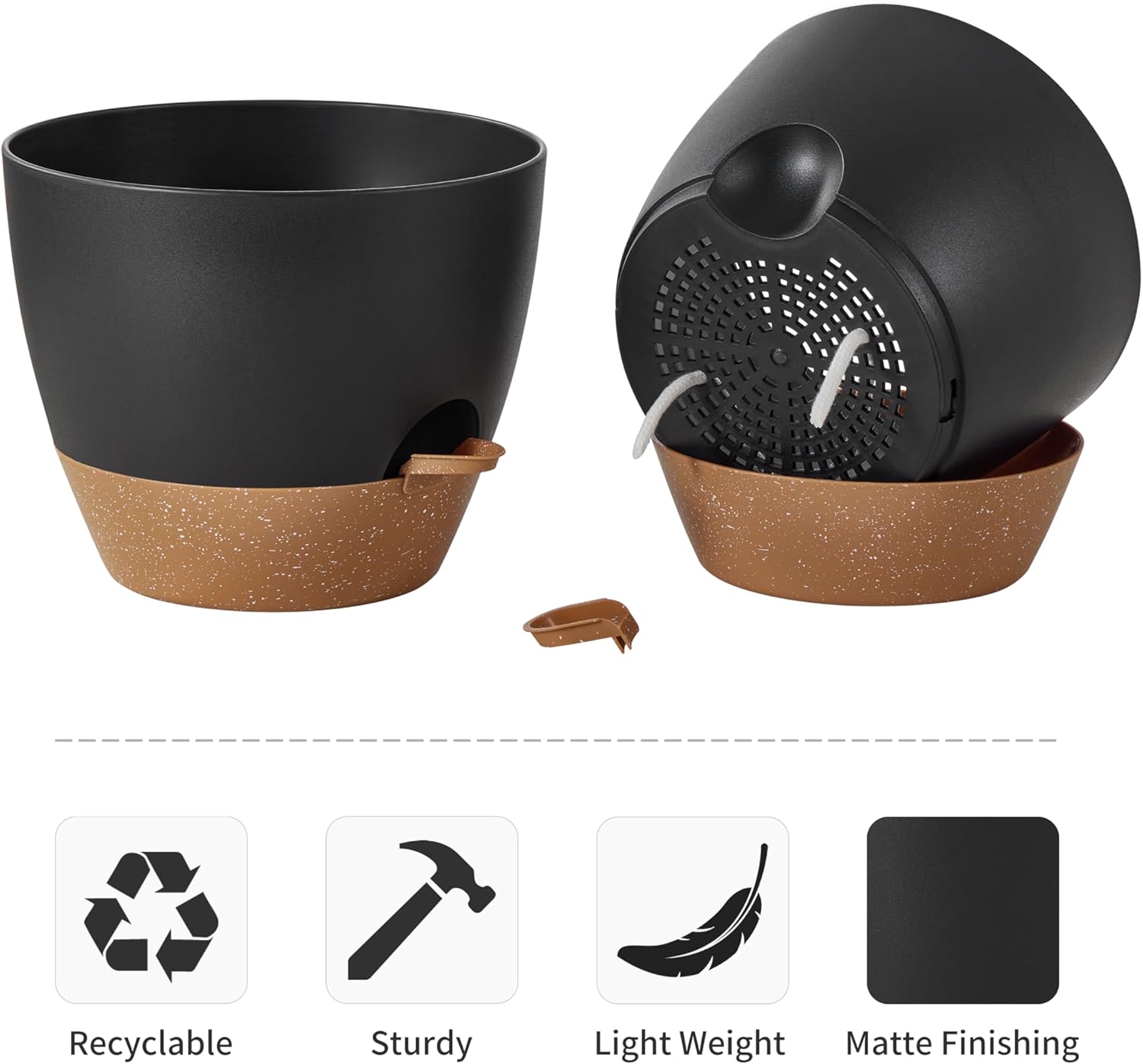 FaithLand 3-Pack Planter Pots, 10 9 8 Inch Self Watering Flower Pots for Indoor Outdoor Garden Plants, Black with Brown