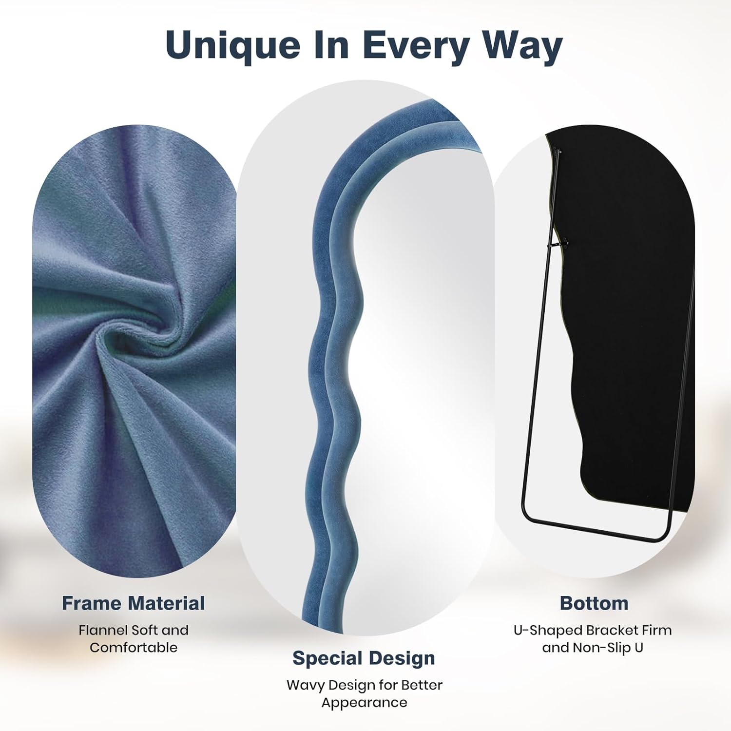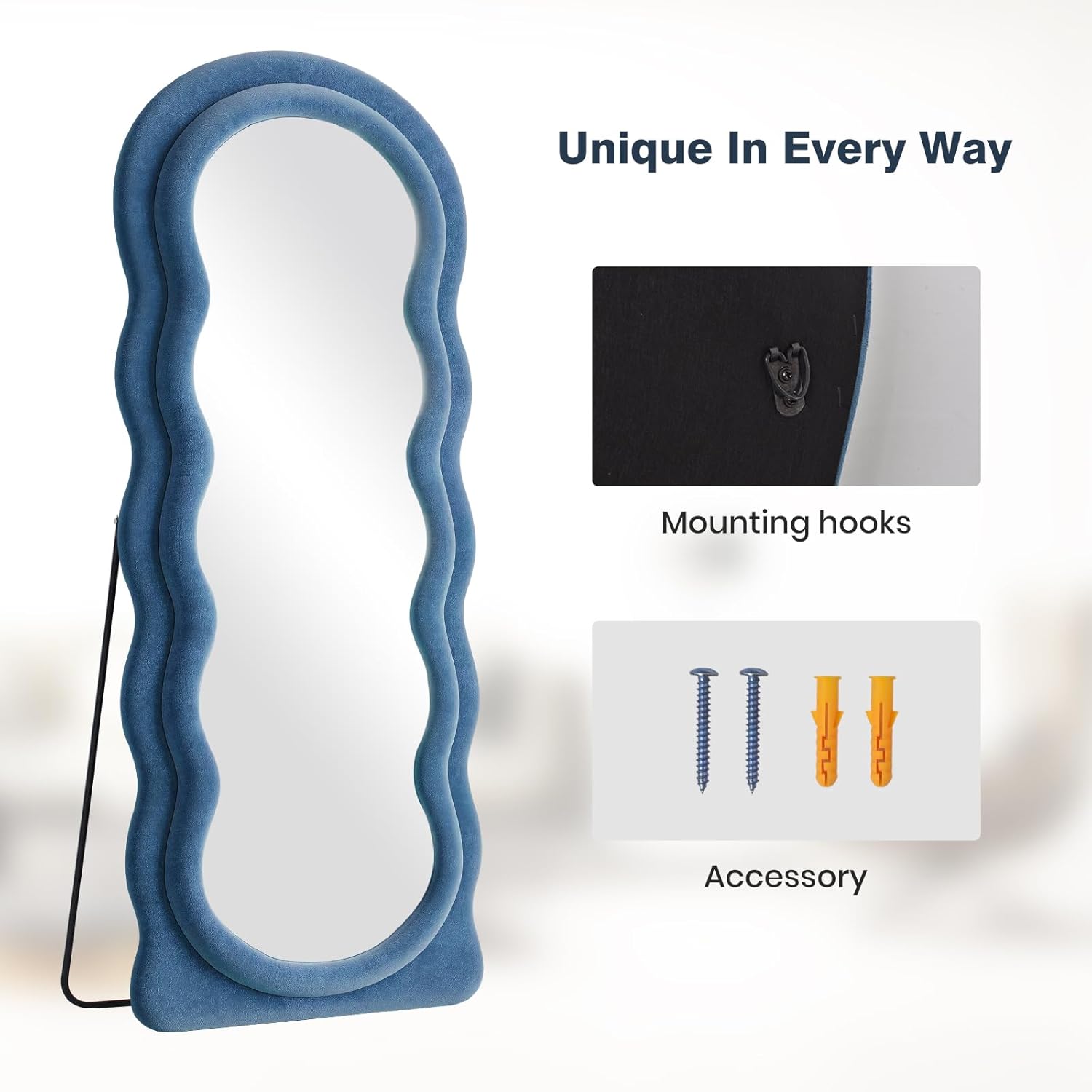 - Blue Flannel Irregular Wavy Frame Floor Mirror: The full length standing mirror features a modern style that can complement any type of room decor, adding a touch of elegance to your room. It will be a great wall decor art piece for your home. This full body mirror with sleek looking is also great for selfies or pictures in general