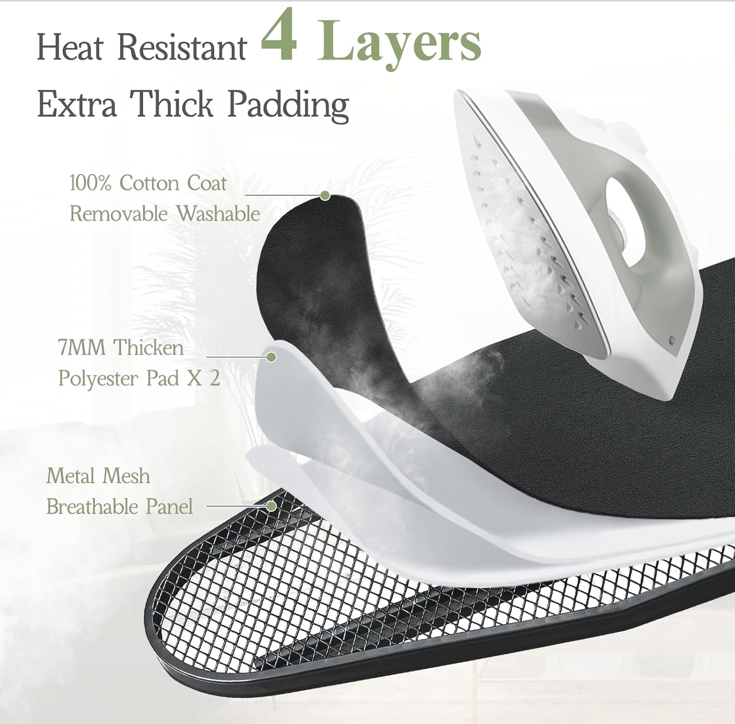 - Iron Board Cover: Heat-resistant ironing board cover with an ultra-thick, 2-layer cotton padding absorbs heat and creates an ideal ironing surface, enhancing the ironโs glide, making the task quicker and easier.