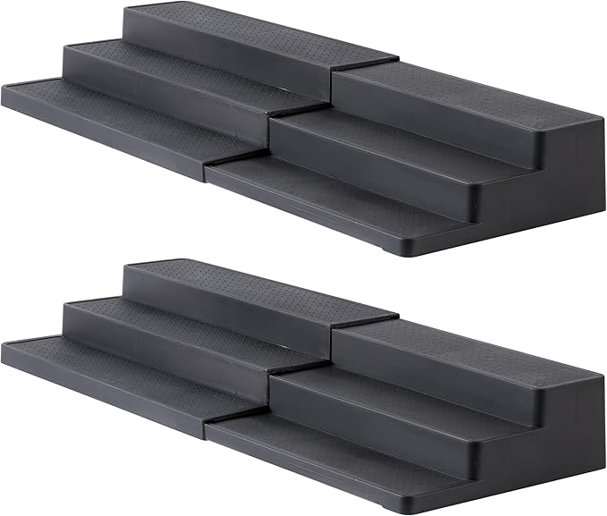 - SET INCLUDES: The 3 tier shelf set comes with 2 racks, the 3 levels increase visibility and easy access to the items on your kitchen counter or cabinets. Deep shelves helps to prevent spills from spreading.