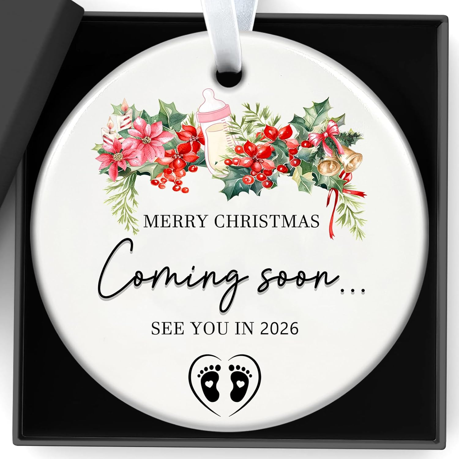 - 【Expecting Baby Ornament 2026】Celebrate the exciting news of your growing family with our Expecting Baby Christmas Ornament 2026. This beautifully crafted acrylic ornament features the phrase "Merry Christmas Coming Soon... See You In 2026," along with colorful Christmas garland designs and baby footprints, symbolizing the joyful blessings of a new addition to the family.
