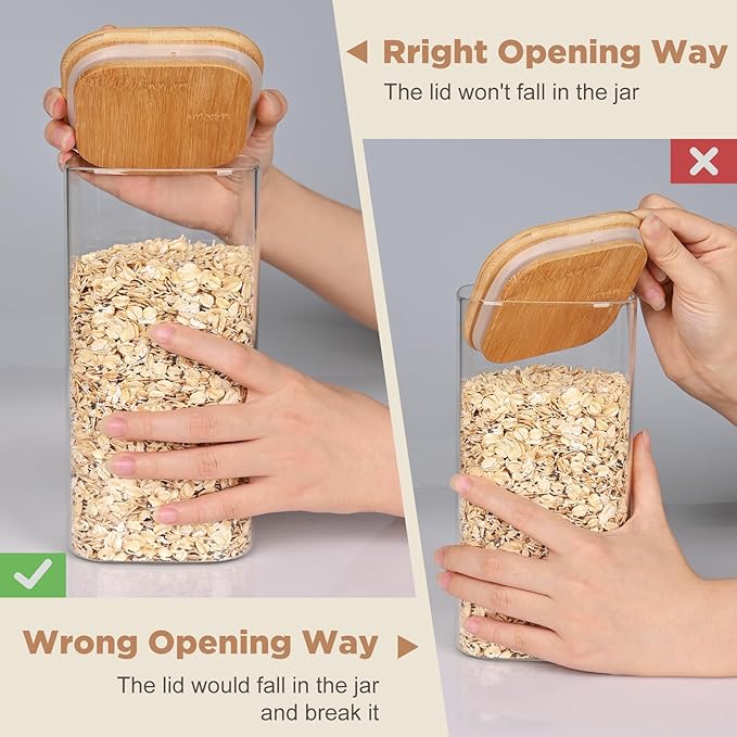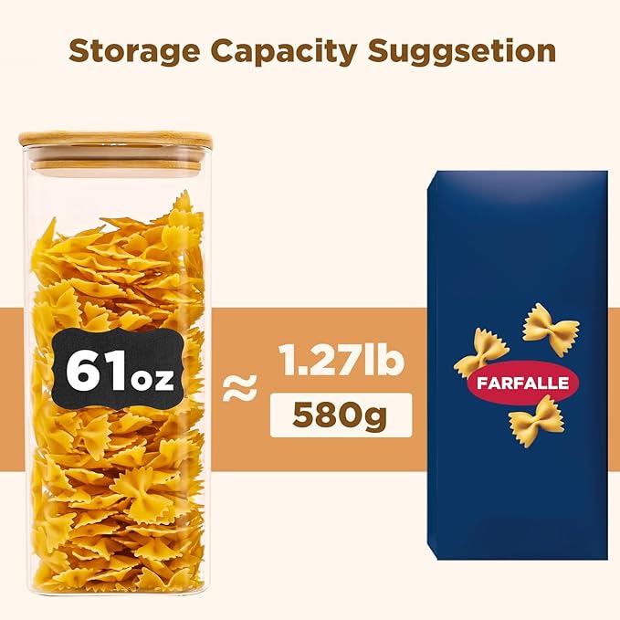 - [Premium quality and safety assurance] Our glass containers with bamboo lids are made of premium quality and borosilicate glass, glass pantry storage containers can withstand the harsh tests of daily use. The bamboo lid provides an airtight seal, ensuring the freshness of stored food. Our glass food storage jars are BPA Free, Phthalate Free, PVC Free, Lead Free, They are healthy and reliable choice for your kitchen.