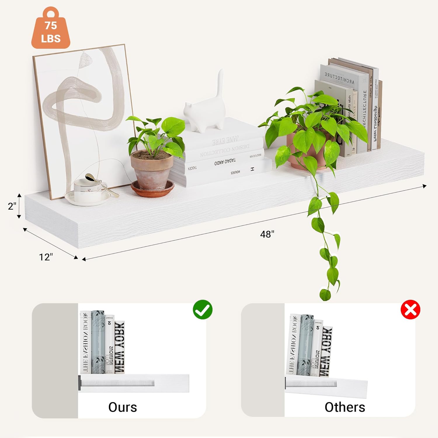 Heimlove 12 Inch Deep Floating Shelves, 48 x 12 inches Long, Large Display & Storage Shelf, Rustic Wood Wall Shelves for Fireplace Mantel, Set of 1(White)