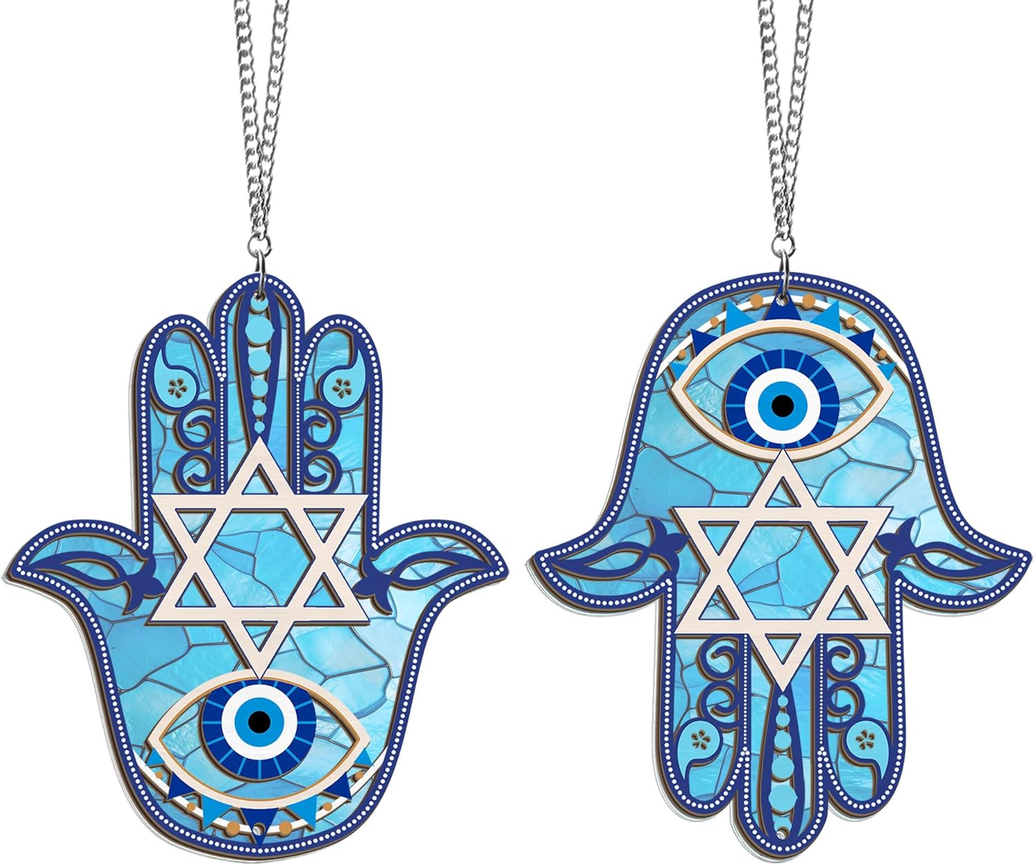 - HANUKKAH GIFTS FOR WOMEN, MEN β Celebrate the profound symbolism of the Hamsa protection amulet with our exquisite suncatchers for windows hanging. Adorned with the Star of David and Blue Evil Eye design, these house warming gifts for men, women, good luck gifts for mom, friends bring a serene touch of Hanukkah and Jewish spirit to your room, wall decor.
