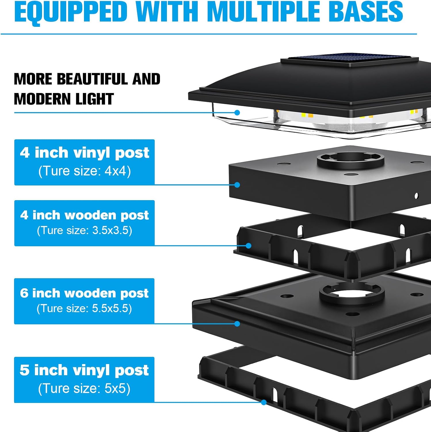 - 【Fit for post size】Our solar deck post cap lights come in various sizes. It is suitable for 4x4 wooden post, 6x6 wooden post, 4x4 vinyl post, 5x5 vinyl post. It can illuminating fences, decks, mailboxes,making them a versatile and stylish addition to any outdoor space.