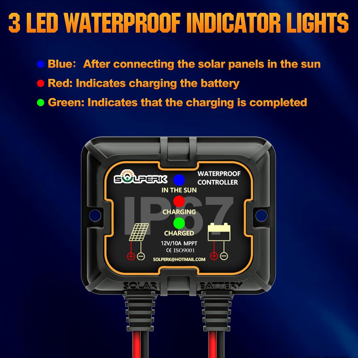 - 【Easy to install】Pre-drilled holes on the back and plug and play cable, solar panel and controller are connected, blue light is on, red light is on when battery is connected, green light is on when battery is fully charged