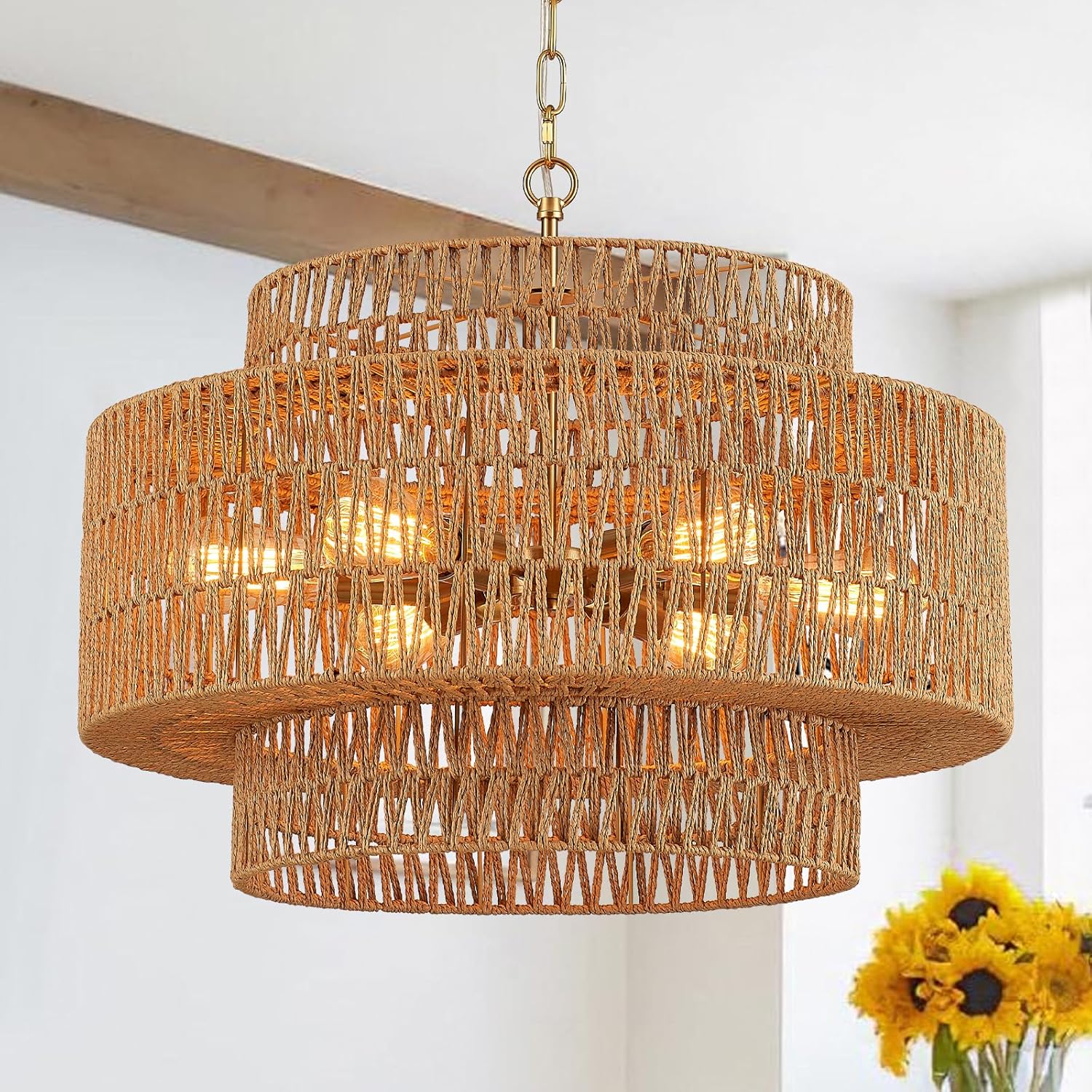 - 【3-Tire Design】The 3-tier rattan chandelier's simple wicker weave and golden finish metal frames bring a vintage bohemian style. This farmhouse chandelier light fixture features three round metal frames that form a captivating semicircular hollow cage. This design sets it apart, adding an element of sophistication.