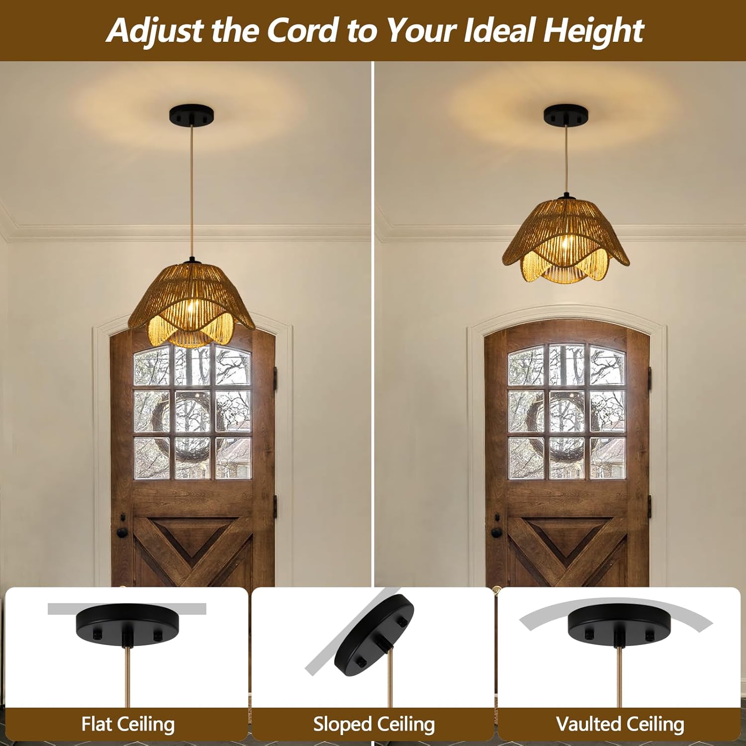 - 【Height adjustable】Boho chandelier size:D 12.59" x H 7.08". The 55.1 inch cord provides enough length for you to adjust the rattan pendant light to the desired height for your lighting needs according to your preference and design, also suitable for vaulted or sloped ceilings.