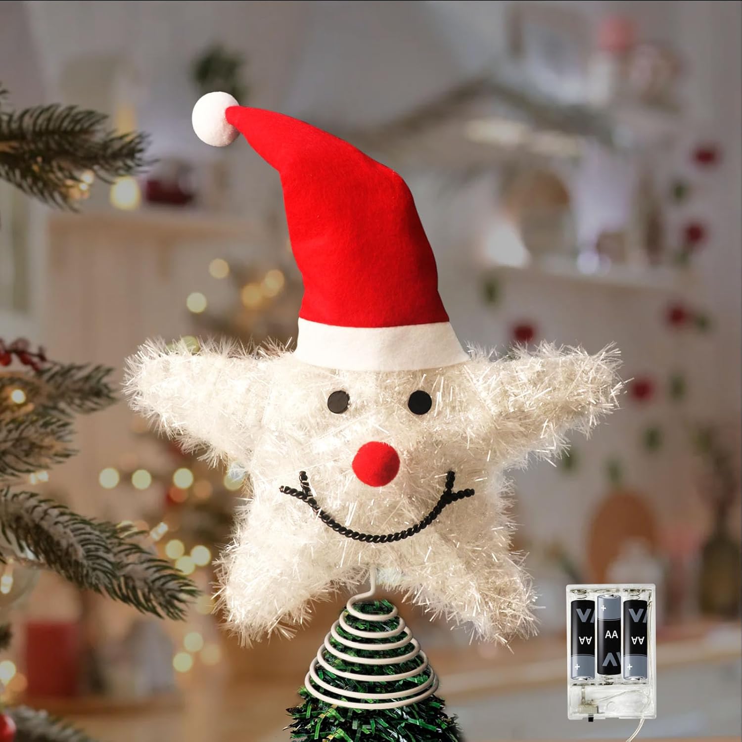 - CHARMING SNOWMAN TREE TOPPER STAR: The snowman star wears a Santa hat with a cheerful smile that incorporates classic holiday elements, especially endearing. A string of warm white LED lights inside that glisten in the charming warm light, this star decoration adds sparkling elegance and vivacity to your Christmas tree