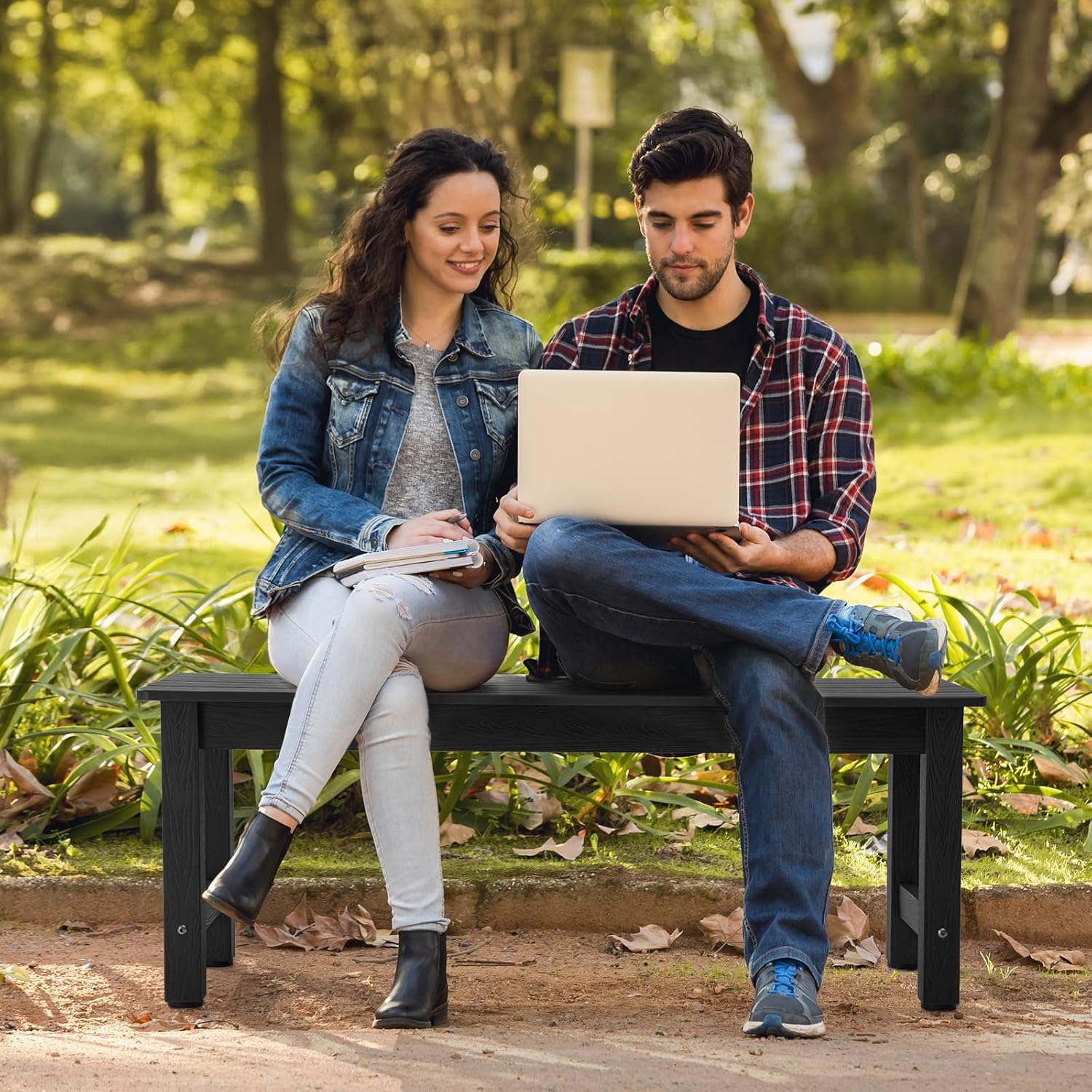 Outdoor Bench, 2-Person Poly Lumber Garden Bench, All-Weather Patio Bench Will not Rot and Fade for Garden, Porch, Backyard and Park, Easy Installation, Black