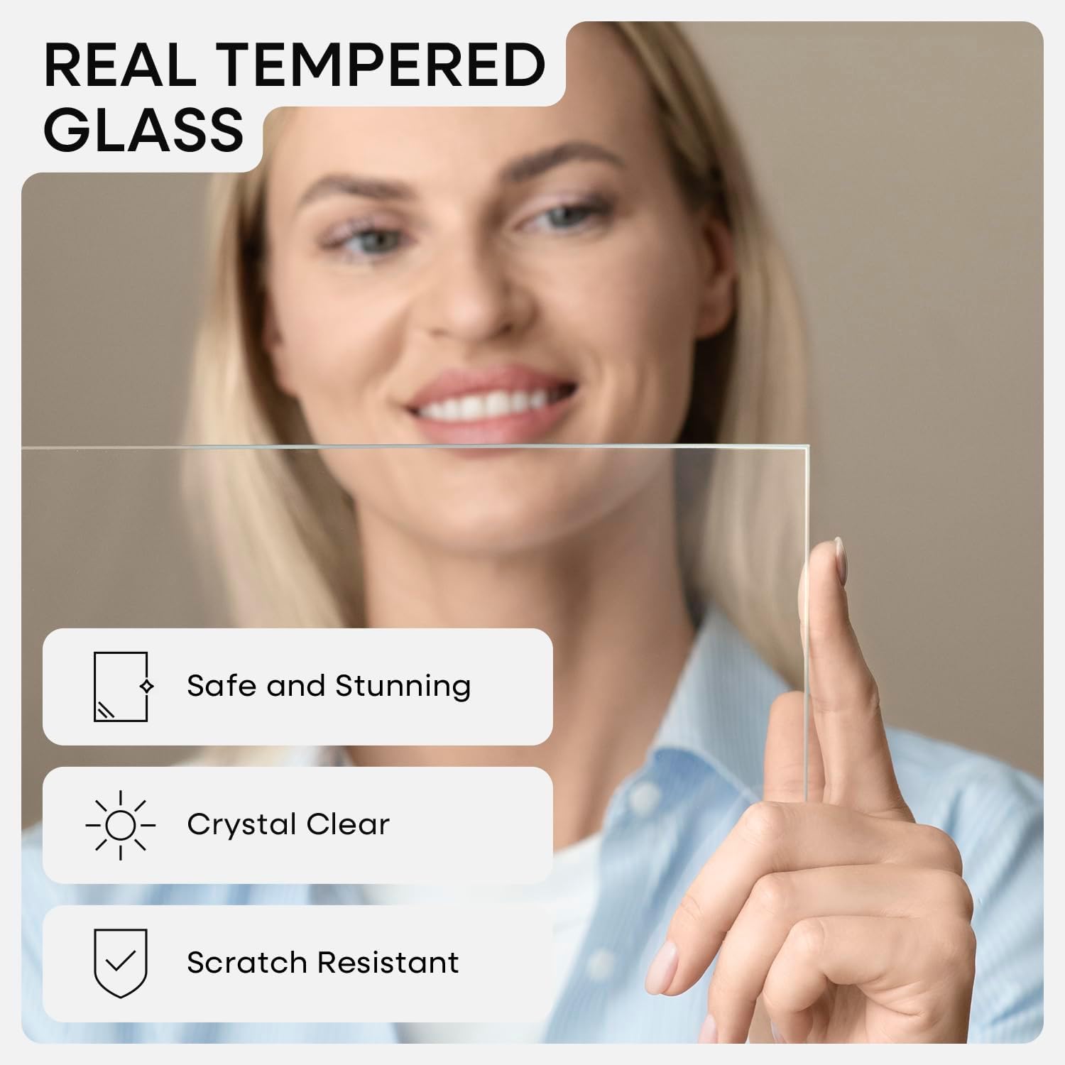 - GALLERY GRADE GLASS, TRUE CLARITY. Why settle for cloudy plexi? Our ultra-clear tempered glass sharpens every detail and adds instant polish to your photo or print.