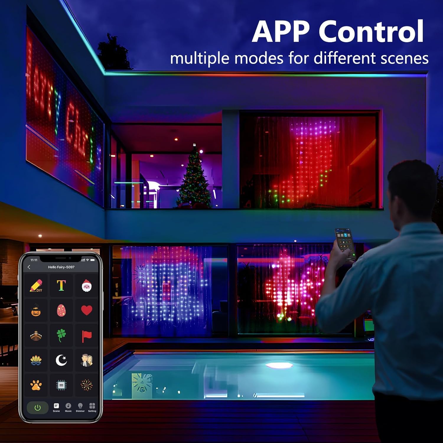 - ✨【MULTIPLE SCENES & DIY MODES】: Our remote offers access to 144 captivating holiday-themed patterns, including Christmas, Halloween, Easter, and more. You can adjust music sensitivity, light position, and speed directly from the remote. But via app, you can take it further by uploading your own photos or drawing custom designs. Create unique lighting effects by sketching a heart, writing “LOVE U,” or uploading any image to sync with your curtain lights, adding a personal touch to any scene.