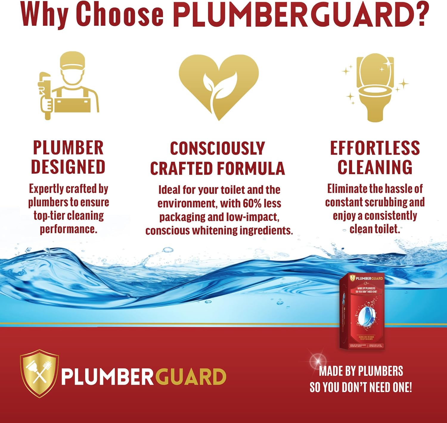 - Effective Cleaning: PLUMBERGUARD is formulated with a low-impact chelating agent and whitening agents, designed by plumbers for a powerful yet gentle clean. It actively whitens while fighting tough stains, rust, mineral deposits, and limescale buildup, ensuring a pristine toilet bowl without harsh chemicals.