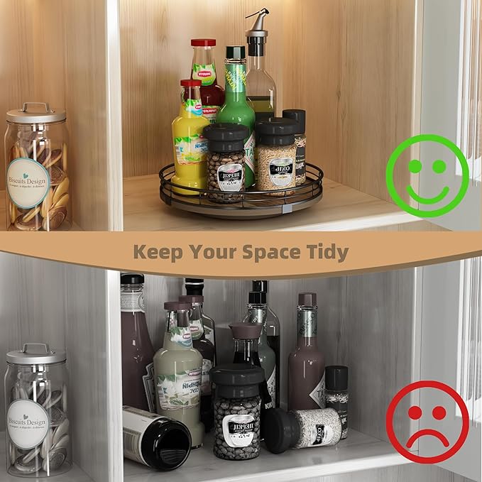 - 360°Smooth Rotation - The lazy susan turntable rotates smoothly and silently, placed next to the stove for easy access to condiments, spices, olive oil and cooking supplies. Placed next to the sink to display soap lotion. Thoughtful kitchen countertop organizers to rid your life of clutter!