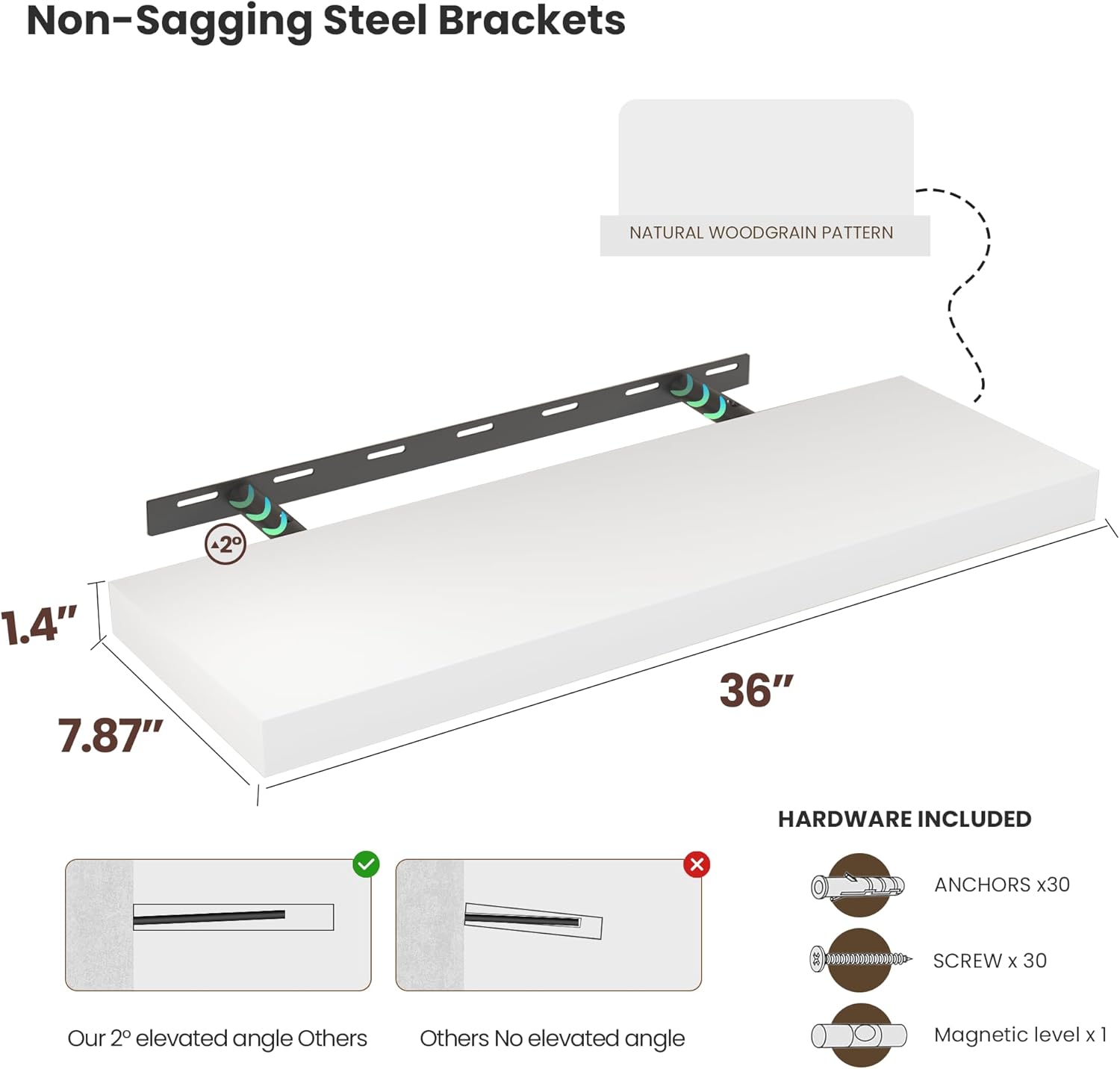 • Premium Wooden Floating Shelves -Unlike others, they are beautifully-finished, fantastic-smelling solid pine,and they are handcrafted out of finest solid pine wood measuring 36" x 8" x 1.38",revealing its own character of knots and natural wood grain, making each ledge a little different but equally stunning.