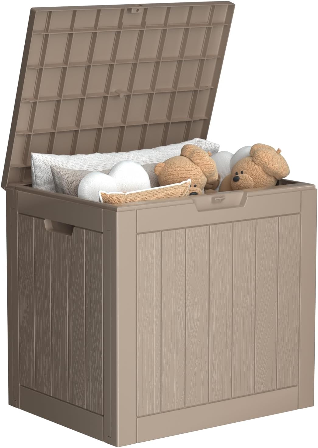 - YEAR-ROUND DEFENSE: The aggregate resin with a wood grain pattern on this deck storage box delivers a blend of beauty and functionality. It's equipped with waterproof, UV-resistant, fade-resistant, rust-resistant, peel-resistant, and warp-resistant features, requiring minimal maintenance over the next several years