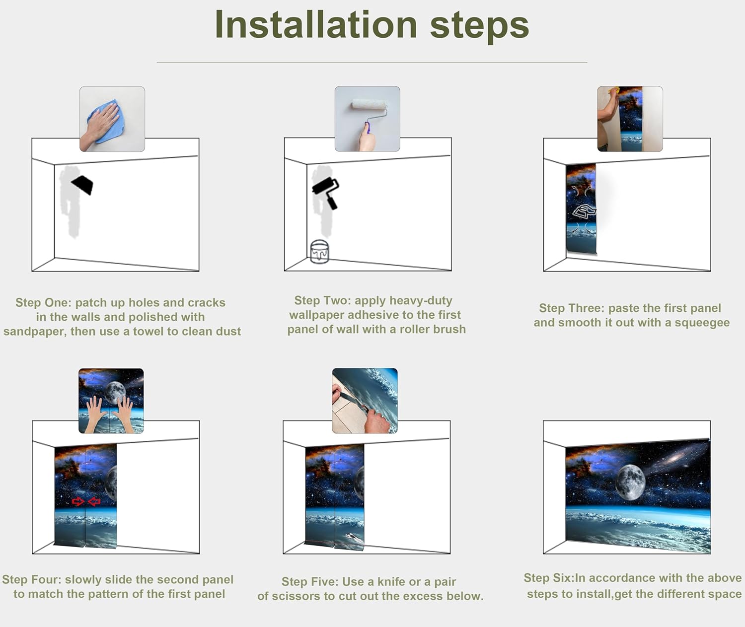 - INSTALLATION - 1.Fill in all cracks or holes and clean dust dirt and grease on the wall surface. 2. Apply the heavy duty wallpaper paste on the wall not mural. 3. Use a spirit level to mark first strip location. 4. match the pattern by sliding into place. 5.use a scraper to smooth out bubbles press. 6. Let dry for a few minutes and that's it! Please Note: Not self-adhesive. We recommend to use a standardized fleece wallpaper paste.
