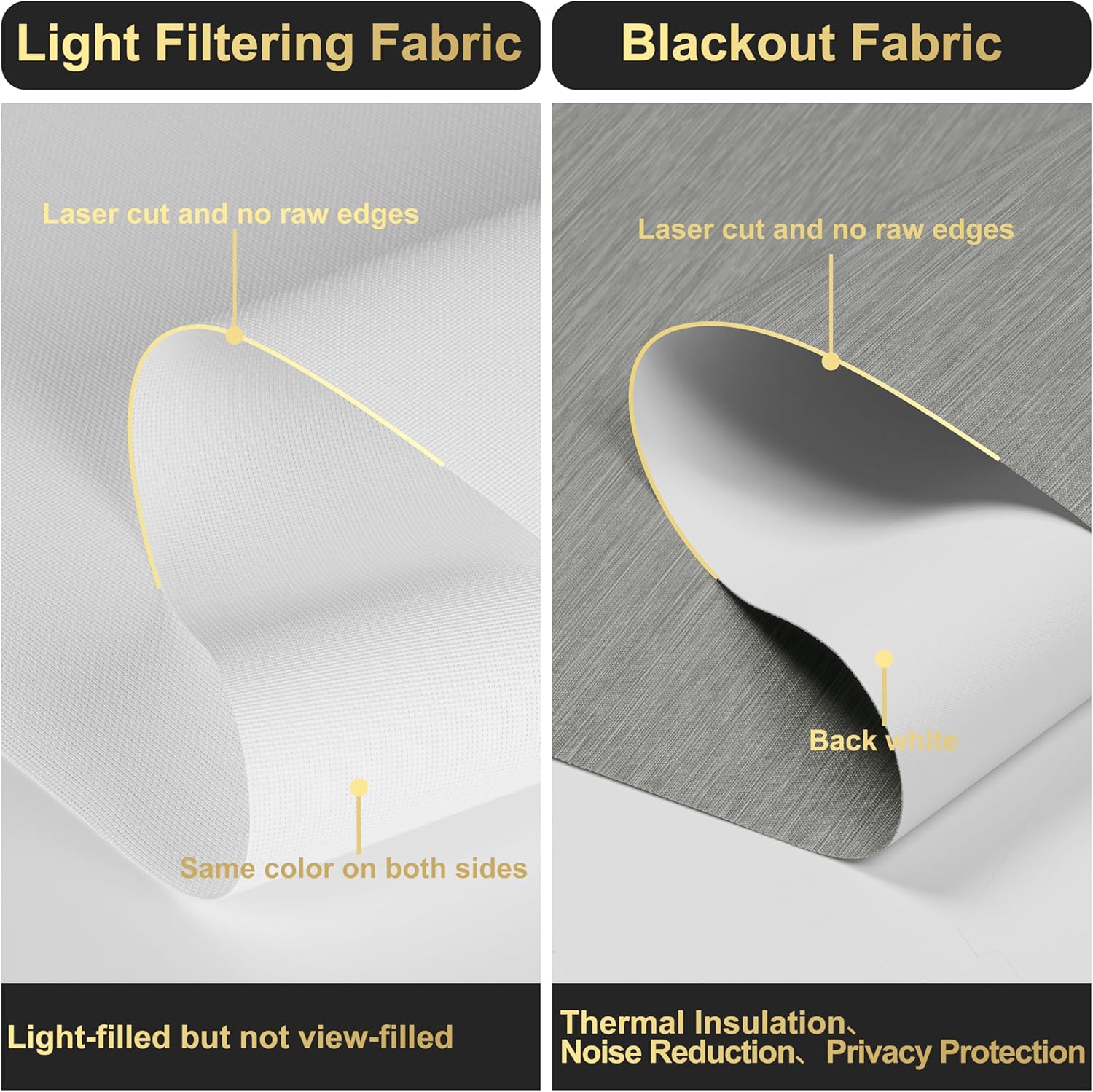 - MULTI-PURPOSE SHADE:Dual roller shades consisting of blackout and light filtering shades, blackout roller shade can 100% blackout,thermal insulation and UV Protection,so that you can experience quiet and comfort of the night during daytime;Light filtering roller shade allow light to filter into your room,and no glare,soft diffused light allow for perfect balance of light and darkness,and also enhances overall aesthetics of your home,allowing for a romantic and comfortable living environment.