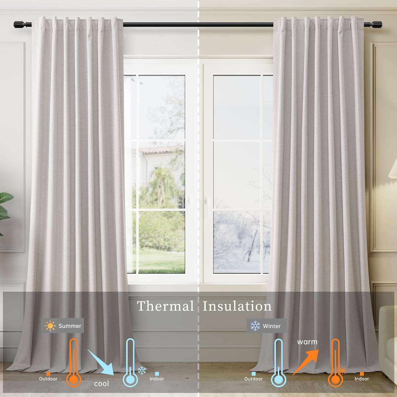 - Thermal Insulated Room Darkening Curtains: The blackout curtains with 300GSM high-density linen blend fabric block out the heat in summer and cool air in winter while sunlight blocking and soundproof. Provide a easy and comfortable home.