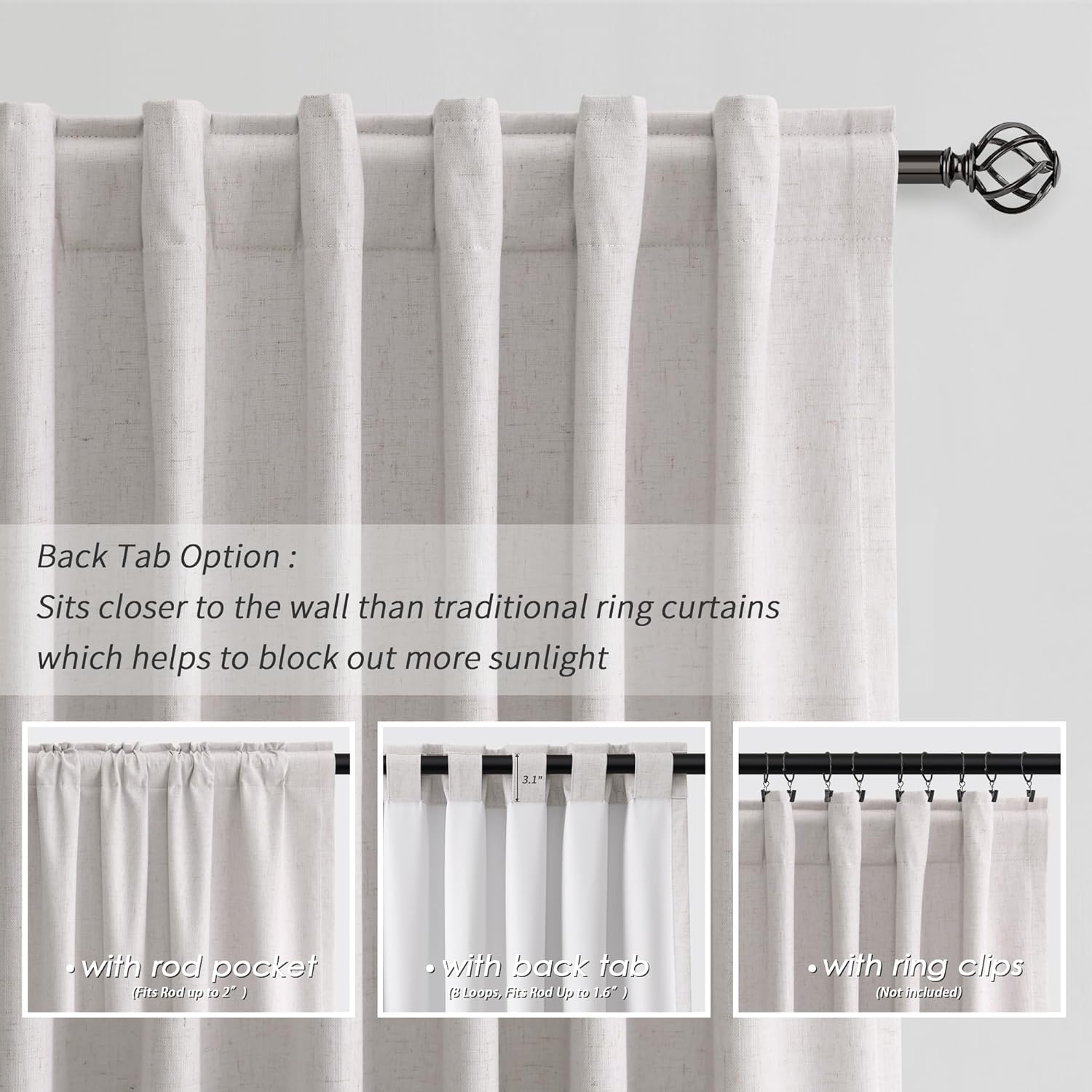 - 3 Hanging Options: Differ from the traditional curtains with grommet, BOODII linen curtains with back tab and rod pocket can full block sunlight fully. (1) Using the back tabs design to create an elegant pleated look and sit closer to the wall than traditional ring curtains, which helps to block out more sunlight; (2) Using rod pocket for a classic effect; (3) Using clip rings on track system or curtain rod, slide open/closed easily (clip rings are not included).