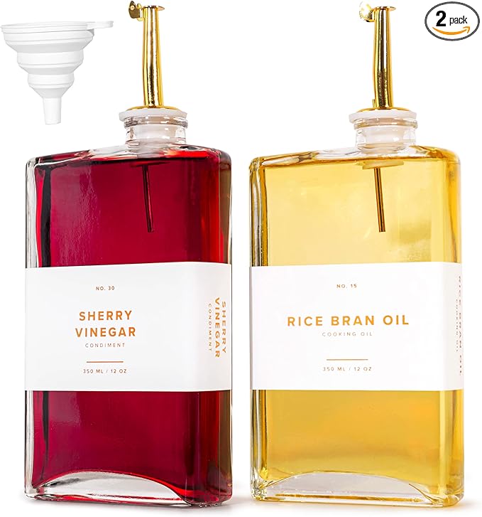 - ELEGANT GLASS OIL DISPENSER FOR KITCHEN: This premium oil and vinegar dispenser set includes two 12oz glass oil bottles for kitchen, designed to keep your favorite oils and vinegars fresh while adding a sleek touch to your kitchen.