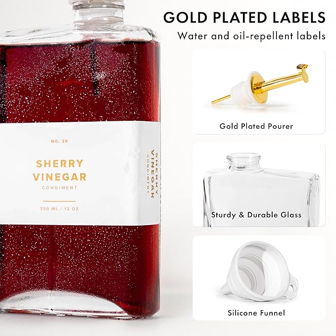 - PREMIUM GOLD LABELS FOR A LUXURIOUS LOOK: The set includes 36 high-quality, waterproof gold labels, ensuring an organized, elegant, and stain-free cooking oil container kitchen setup.