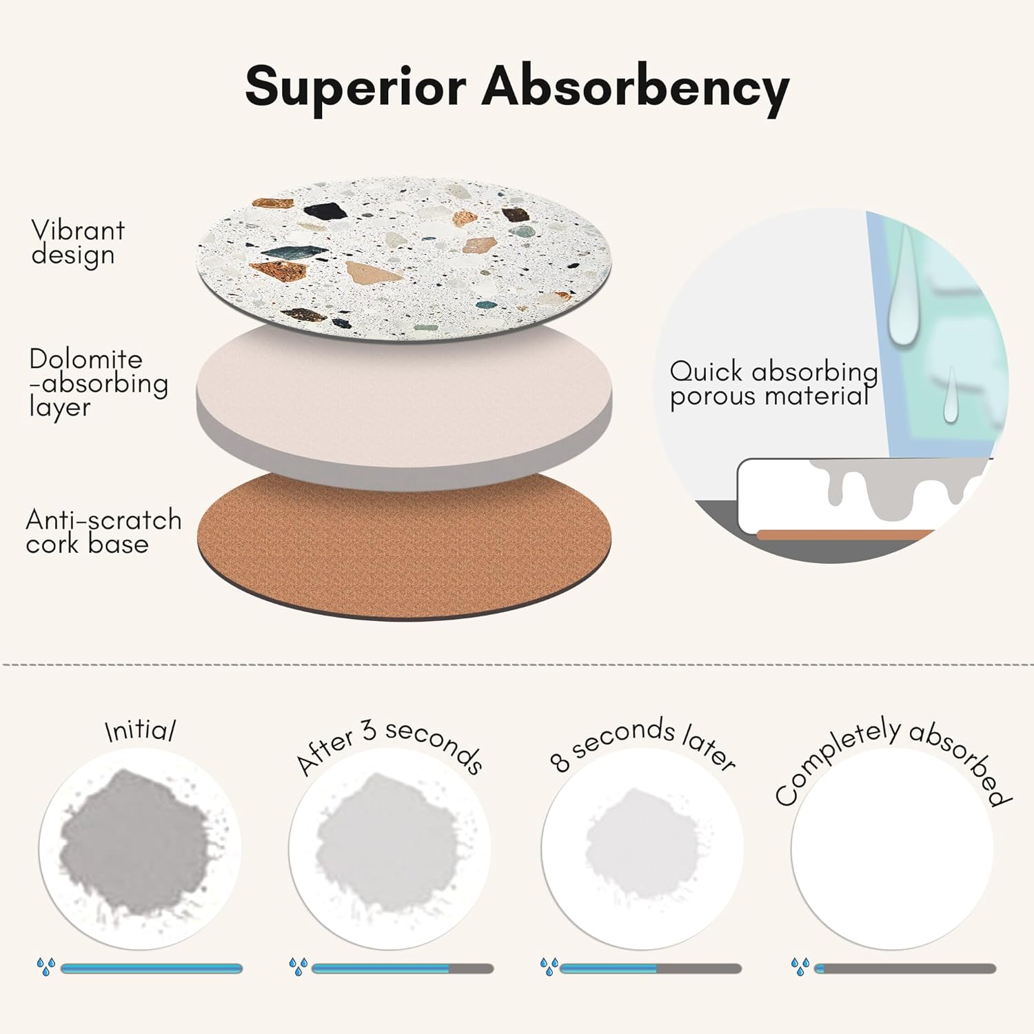 - Highly Absorbent for Hot & Cold Drinks: Our absorbent coasters are made of quality diatomite that absorbs condensation from cold drinks, spills from hot drinks and the absorbency will not detoriate over time.
