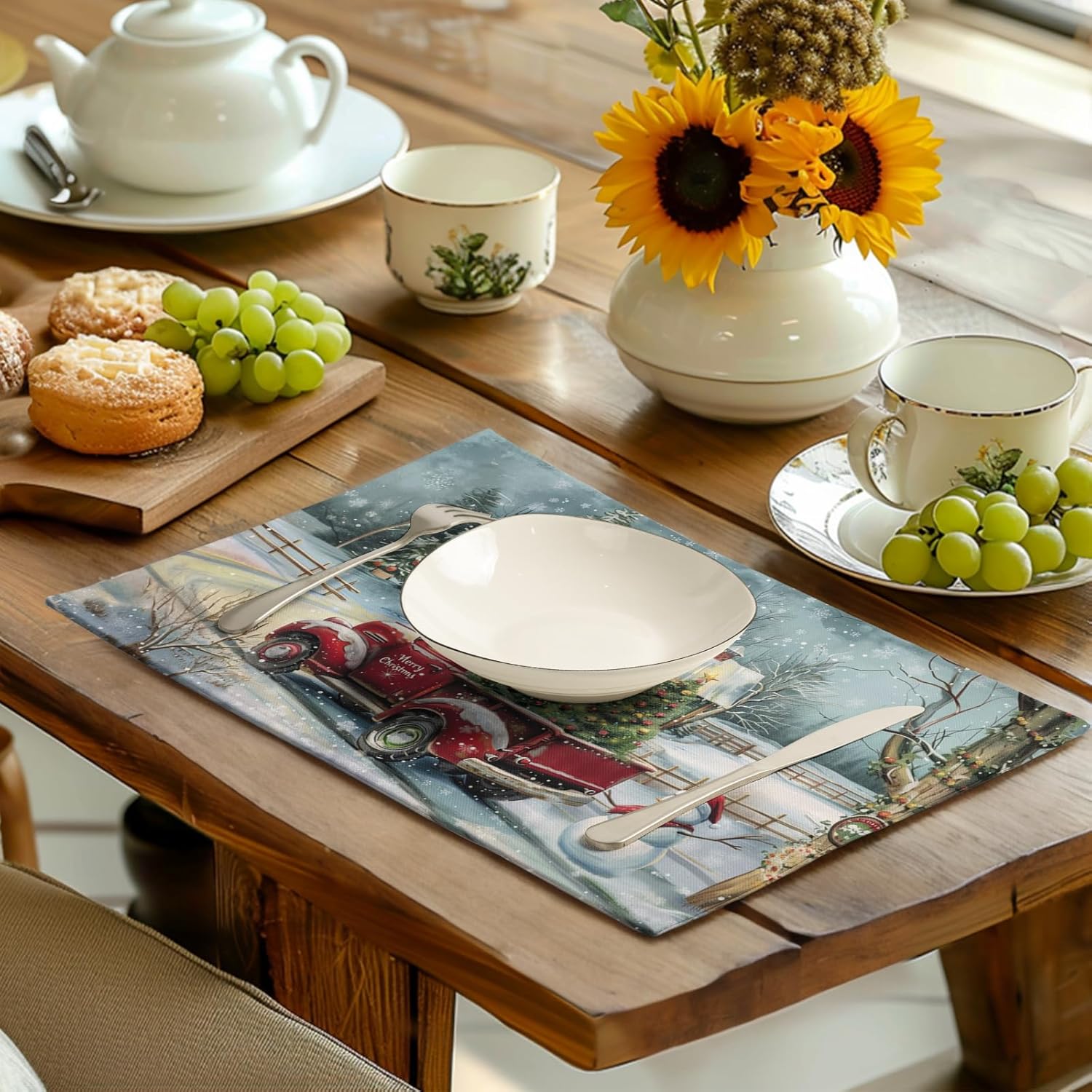 - TABLE DECORATION: The winter farmhouse place mats for dining tables adopts high-definition printing technology, with clear patterns and bright colors; The table placemats is printed with beautiful red truck and pine tree patterns; The unique and eye-catching seasonal patterns add charm to the Christmas table mats, creating a strong Christmas atmosphere for your party