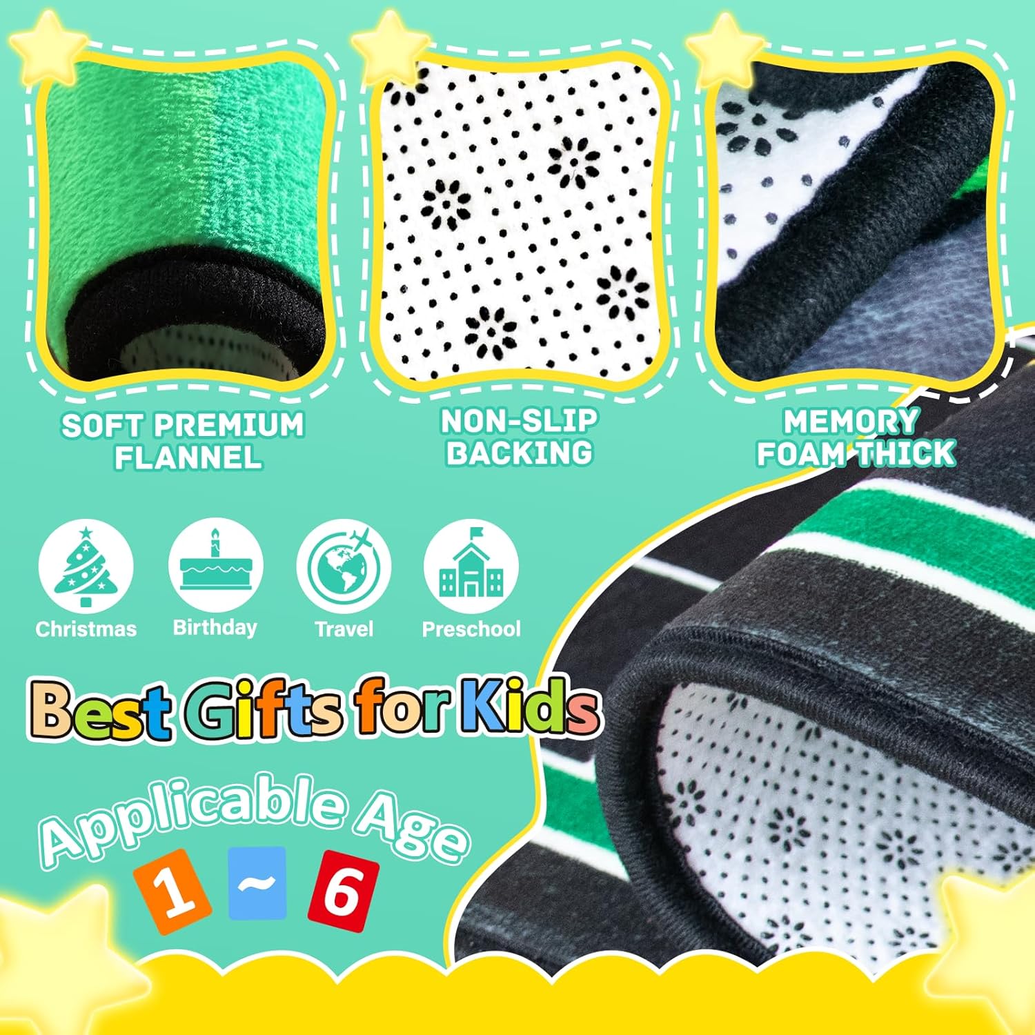 - [Upgraded Material]Our kids playmat rug is made of premium flannel,and high-resilience sponge,equipped with non-slip backing.The kids room rug is designed to provide extra cushioning and comfort,protecting babies from bumps and knocks while crawling