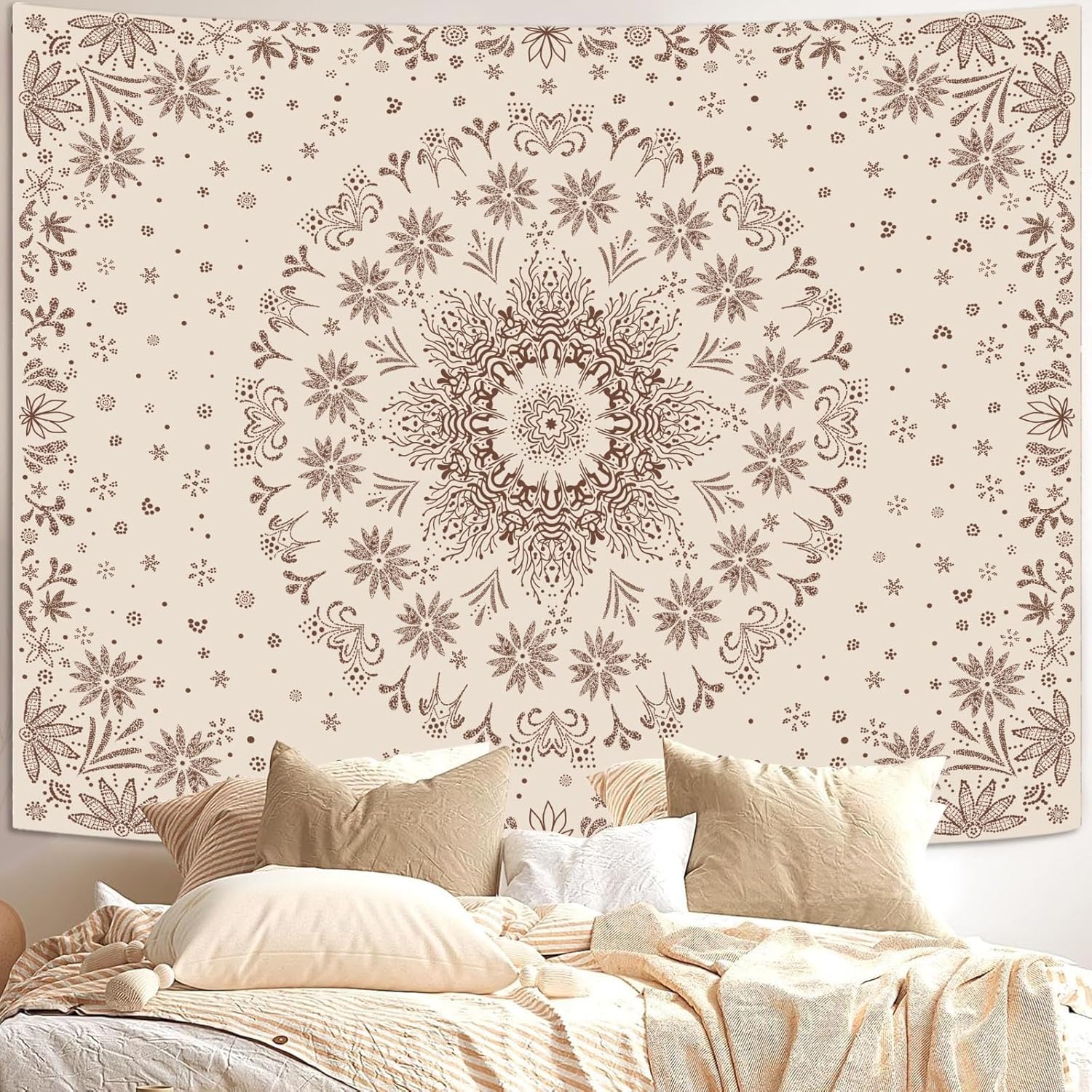 - Intricate Mandala Design: This boho tapestry for bedroom features a beautiful mandala and floral medallion pattern that blends bohemian and modern aesthetics, making it an eye-catching piece of art for your wall