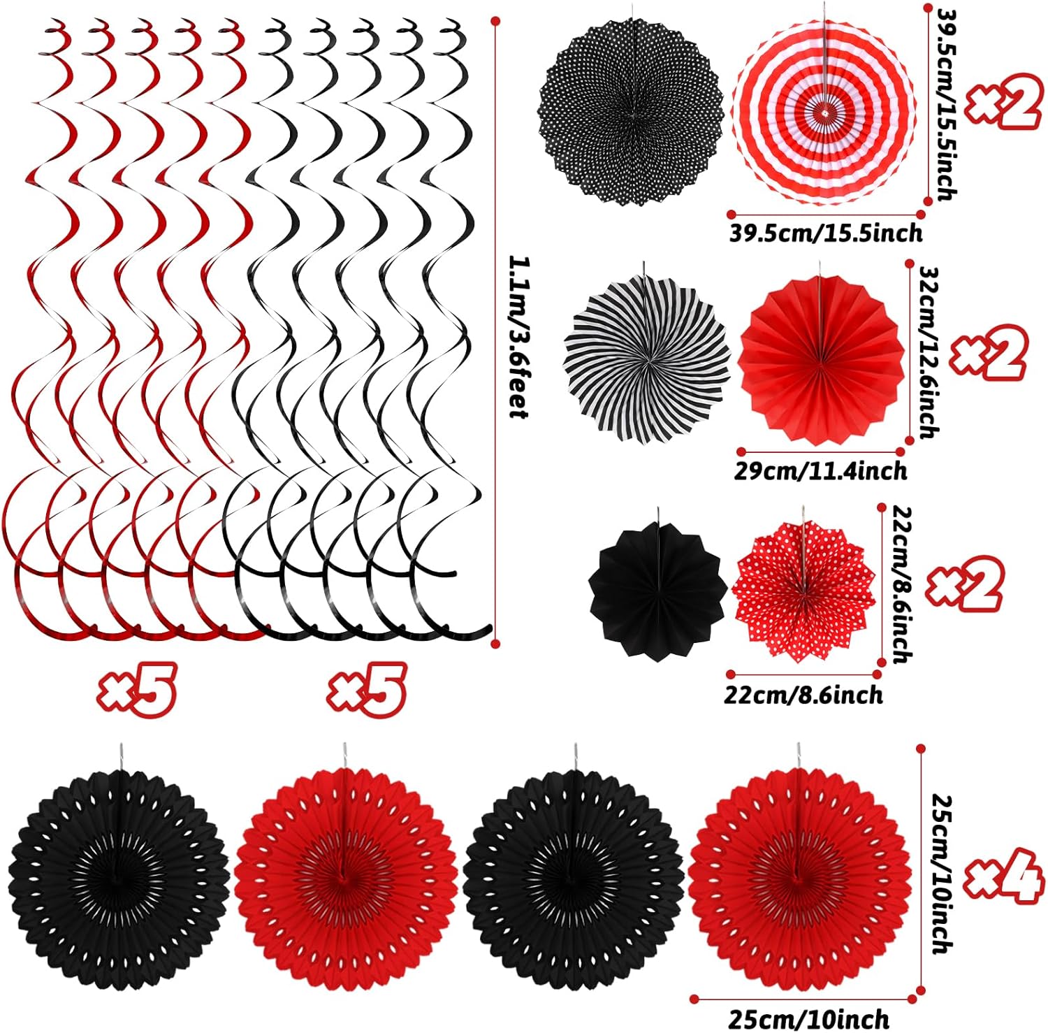 - 【What you will get】6 x Paper Fan, 4 x Paper Honeycomb Ball , 4 x Paper Hollow Fan, 10 x Hanging Swirl, 1 x Paper Hot Air Balloon Garland,1 x Triangular Pennant Garland, 1 x Circle Paper Garland. ( Color: Black and Red)