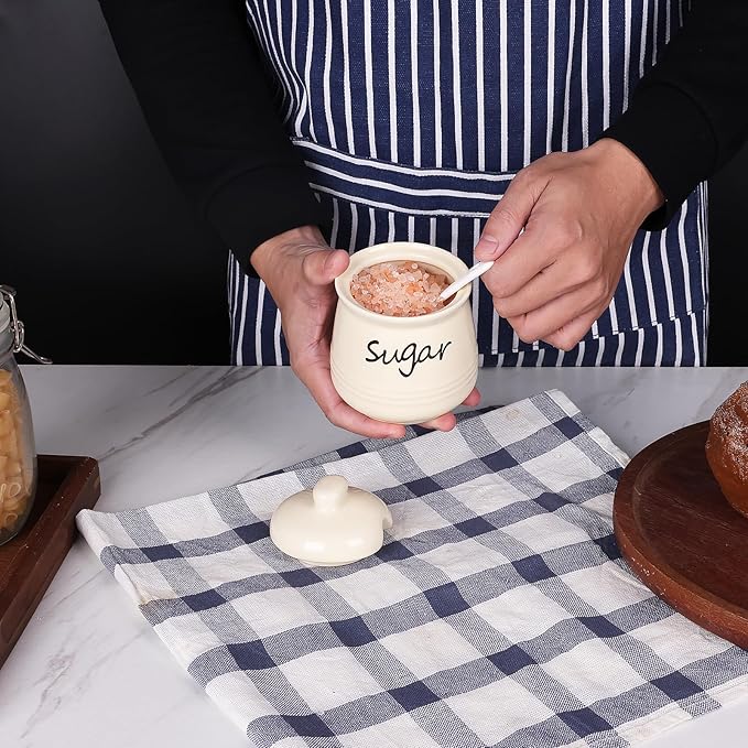 - DESIGN CONCEPT: This sugar bowl is equipped with a lid and a small spoon. The lid can keep your ingredients away from dust. There is a perfect notch on the lid for placing the spoon, so you donβt have to worry about placing the spoon randomly
