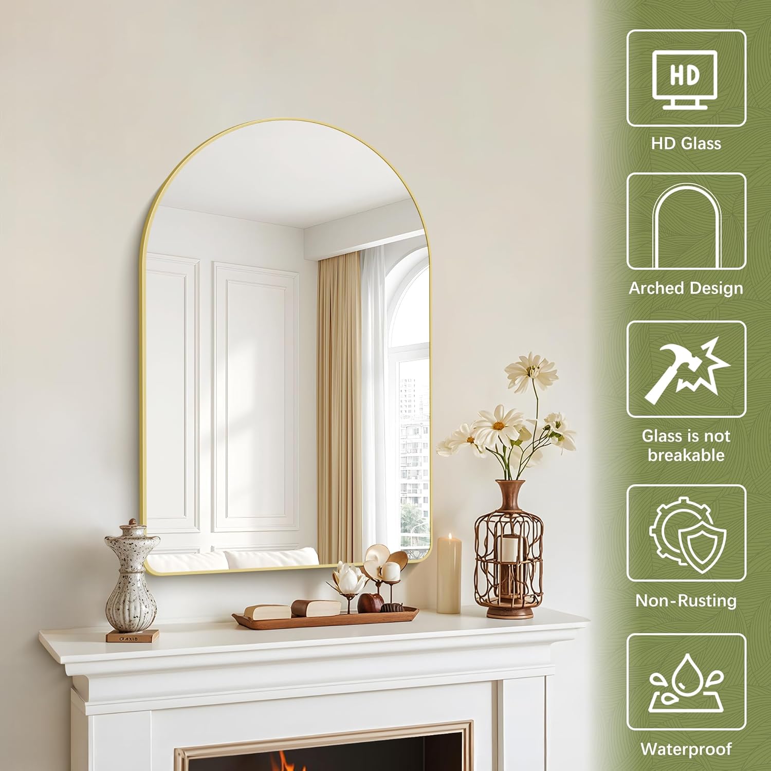 - Widely-Use Decorative Mirror: With gold arched mirror round corner and sleek frame, the wall-mounted mirror looks simple and elegant, fits for any decor style and makes room brighter. Great contemporary mirror for wall decor for over sink, bathroom, bedroom, entryway, living room, Gallery, Hotel, Salon and more.