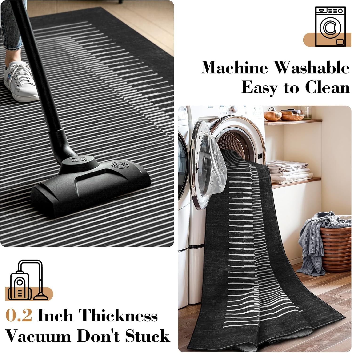Wonnitar Washable Striped 5x7 Washable Area Rug, Non-Slip Black Berber Stripe Rugs for Living Room, Low Pile Minimalist Floor Carpet Rugs for Bedroom Dining Room Home Office (Black,5' x 7')