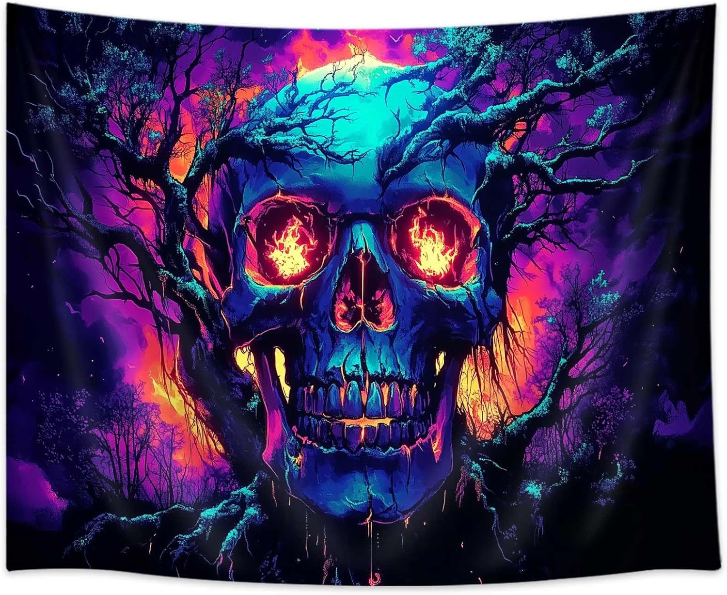 Xiaoput Blacklight Fire Skull Tapestry for Bedroom, Trippy UV Reactive Burning Skeleton Forest Wall Hanging Tapestries, Scary Dark Horror Glow in the Dark Tapestries for Living Room Home Dorm 80X60IN