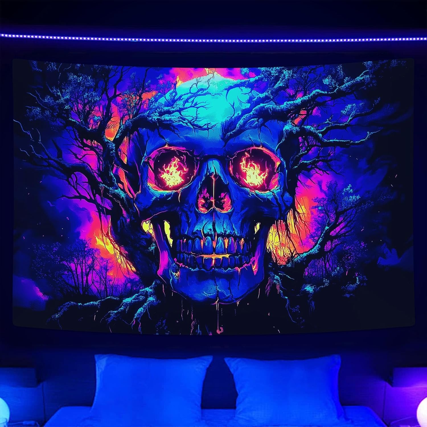 Xiaoput Blacklight Fire Skull Tapestry for Bedroom, Trippy UV Reactive Burning Skeleton Forest Wall Hanging Tapestries, Scary Dark Horror Glow in the Dark Tapestries for Living Room Home Dorm 90X70IN