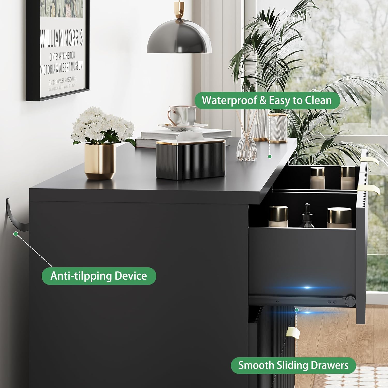 - ăModern Chic AppearanceăThe unique wave-like fluted panel enhances the texture and elegance of this bedroom dresser. The thick table top features natural wood grain that complements the black finish. The wide metal handle and splayed base legs add a modern touch, creating a personalized and distinctive appearance