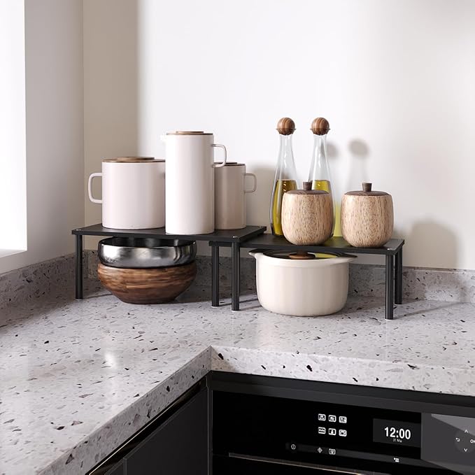 - 【Flexible Combination, Space Optimization】With their unique design, with one slightly smaller than the other, these shelf organizers can be stacked on top of one another, nested, used separately, or even in an L-shape.It is a flexible storage solution that transforms your kitchen into a more organised and tidy space.