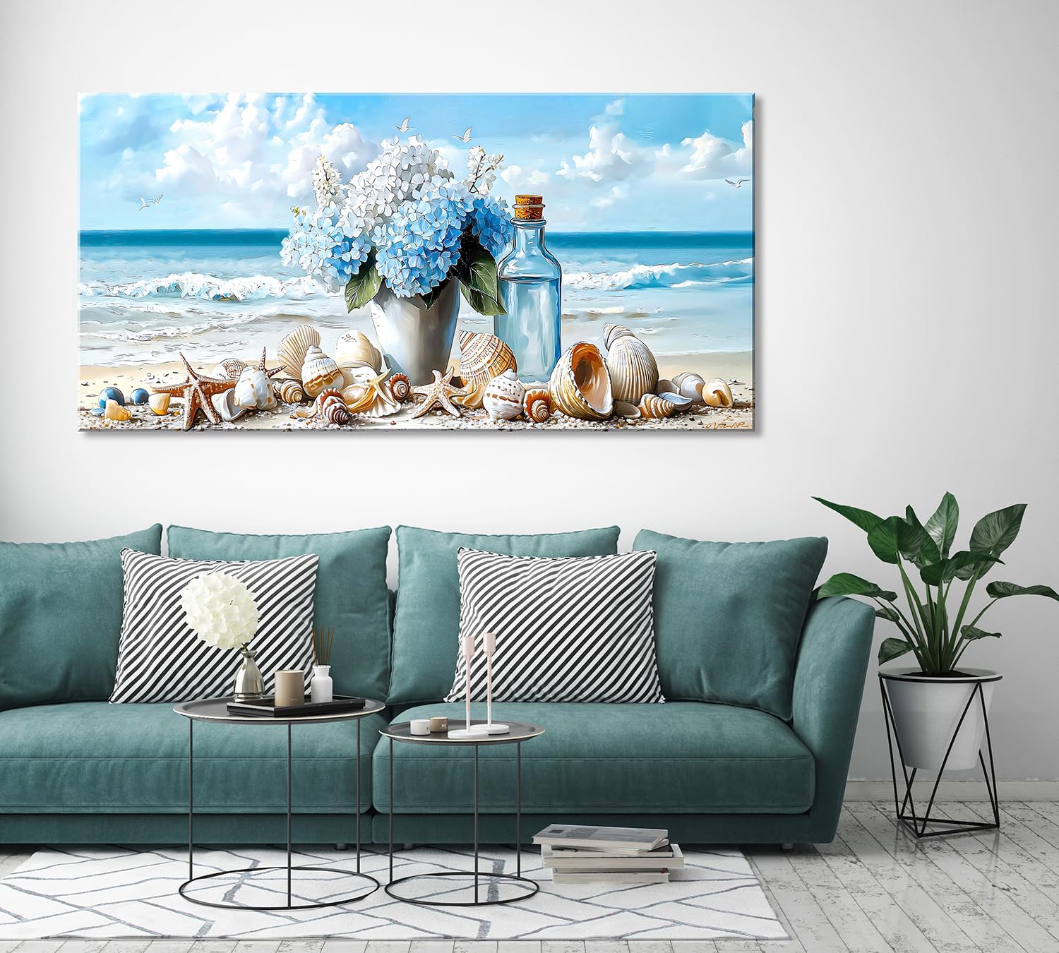 LASMOND Romantic Beach Wall Art for Living Room Blue Shells Conch Vase Canvas Prints Modern Large Flower Bottle Bedroom Ocean Artwork Decor (46x23 Inches)