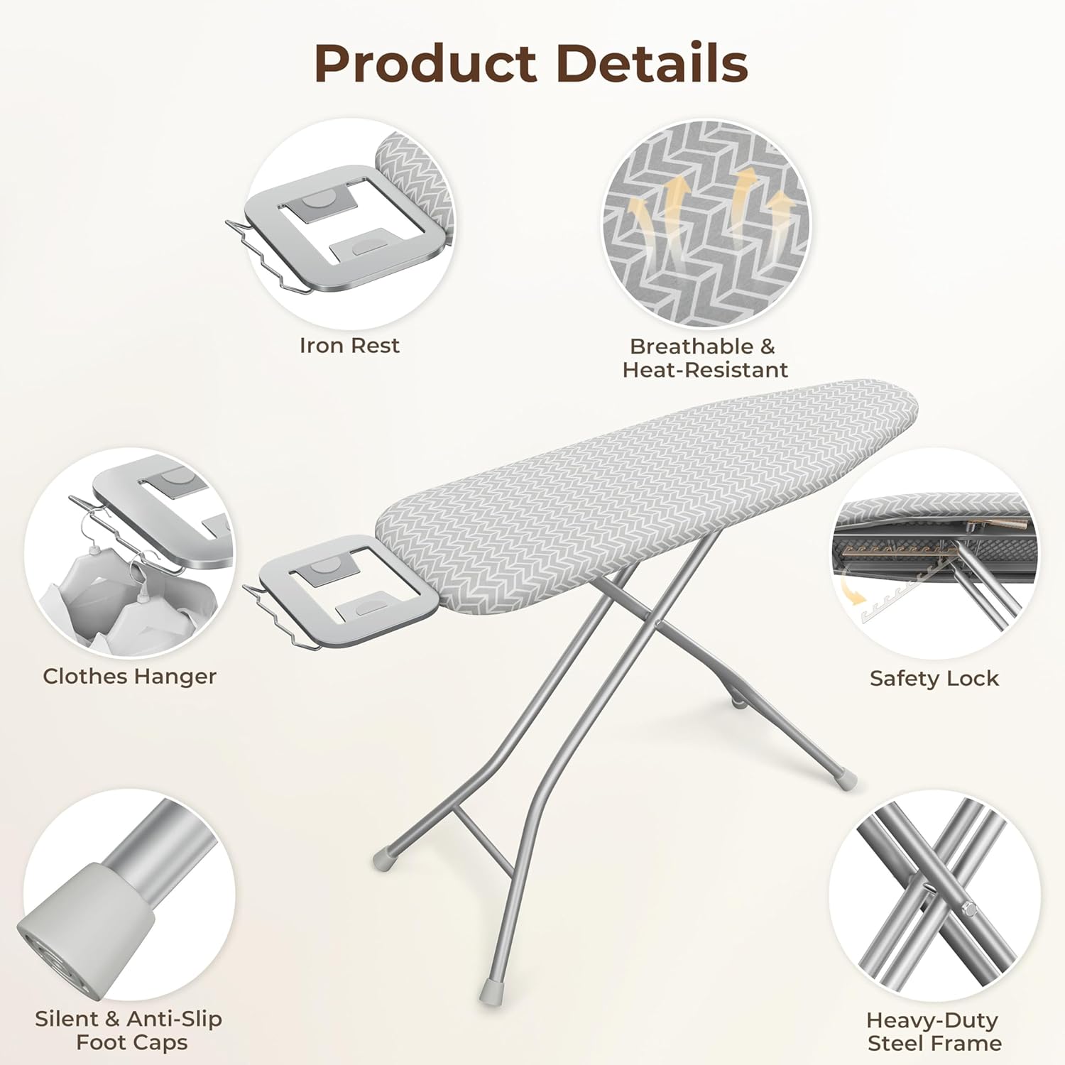 - Adjustable Height: With nine adjustable height settings ranging from 21β³ to 36β³, this ironing board can be adjusted by a safety lock to fit your comfort level, making it ideal for various working occasions