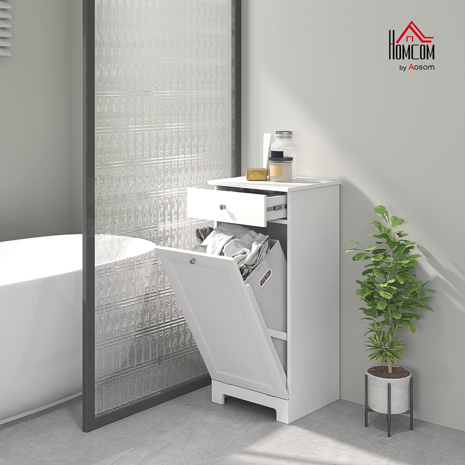 HOMCOM Laundry Hamper with Removable Basket, Tilt Out Hamper with Drawer and Beadboard Door, Bathroom Storage Cabinet, White